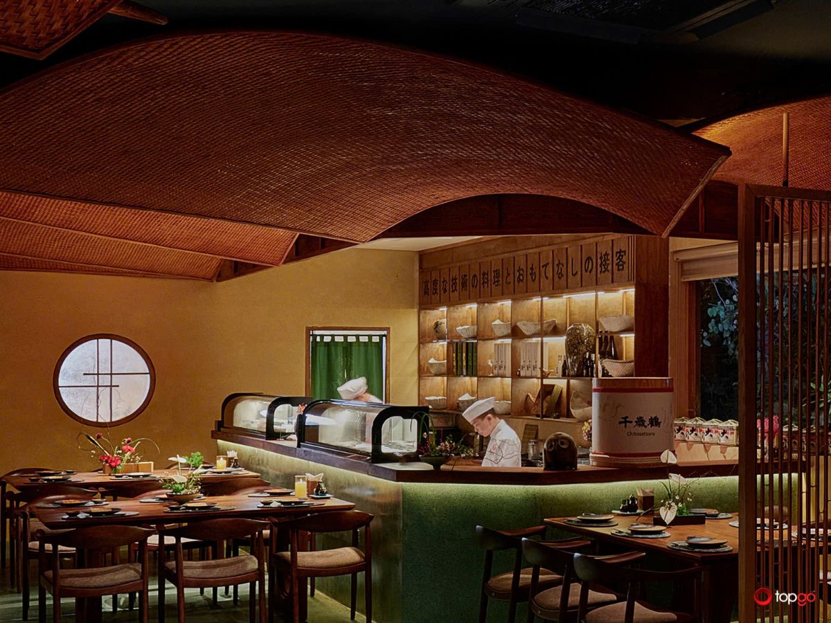 Bên trong nhà hàng, các bức vách được vẽ tay bởi những hoạ sĩ hàng đầu Việt Nam. Hình ảnh lễ hội Kyoto được tái hiện một cách tiết chế và đầy cảm xúc. Mỗi chi tiết đều được tính toán kỹ lưỡng để không lấn át trải nghiệm ẩm thực. Ánh sáng, vật liệu và màu sắc được phối hợp hài hòa, tạo cảm giác an yên. Không gian phù hợp cho những cuộc trò chuyện sâu, những buổi tiếp đãi trang trọng. Đây là nơi thời gian dường như trôi chậm hơn.