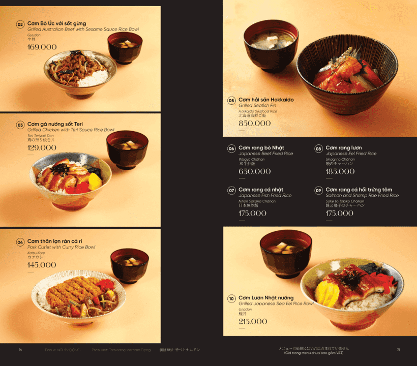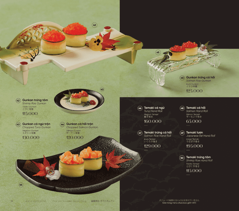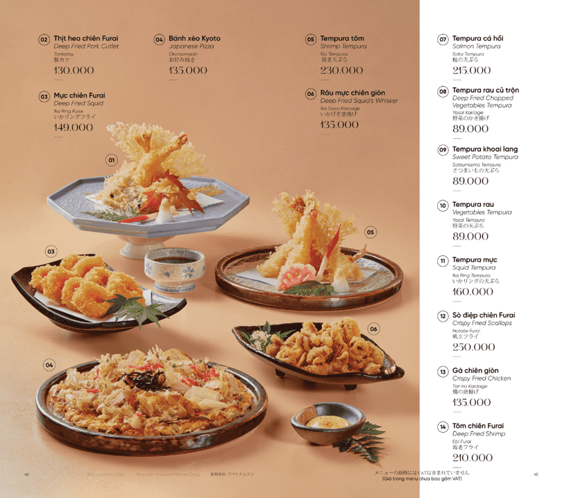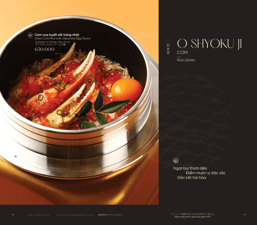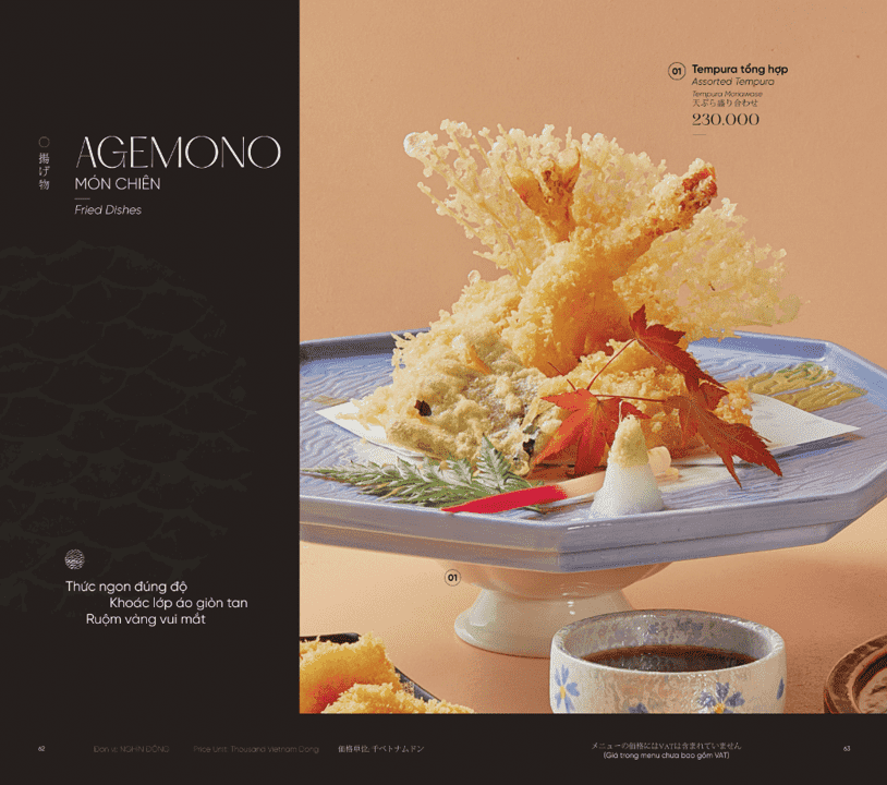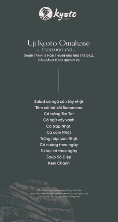 Mỗi món ăn tuân thủ tinh thần thanh nhã, cân bằng và tiết chế đặc trưng của Nhật Bản. Nhà hàng không đặt nặng số lượng, mà ưu tiên tuyệt đối cho chất lượng và độ hoàn thiện. Thực đơn được thiết kế linh hoạt, đáp ứng nhiều nhu cầu trải nghiệm khác nhau. Phù hợp cho bữa trưa nhẹ nhàng lẫn những bữa tối tiếp đãi mang tính trang trọng.