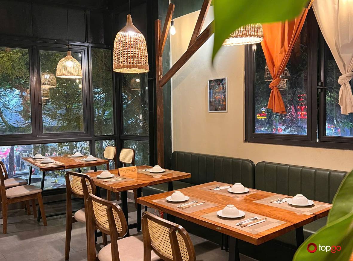 Ánh sáng được điều chỉnh nhẹ nhàng, không quá sáng cũng không quá tối. Không gian vì thế luôn giữ được sự dễ chịu, phù hợp cho cả ban ngày lẫn buổi tối. Đây là kiểu không gian khiến thực khách muốn ngồi lại lâu hơn mà không cảm thấy mệt.