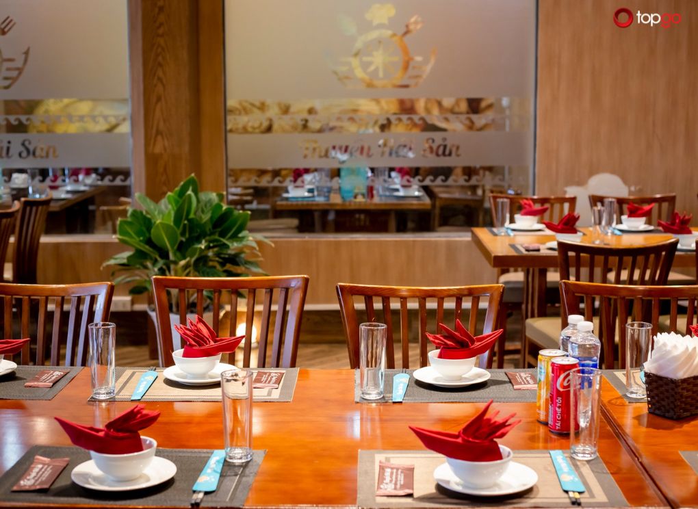 Ấn tượng đầu tiên khi bước vào Nhà hàng Thuyền Hải Sản là không gian khá rộng. Cách bố trí bàn ghế thoáng. Không tạo cảm giác chật chội dù nhà hàng đông khách. Đây là điểm cộng lớn đối với các bữa ăn gia đình hoặc liên hoan nhóm.