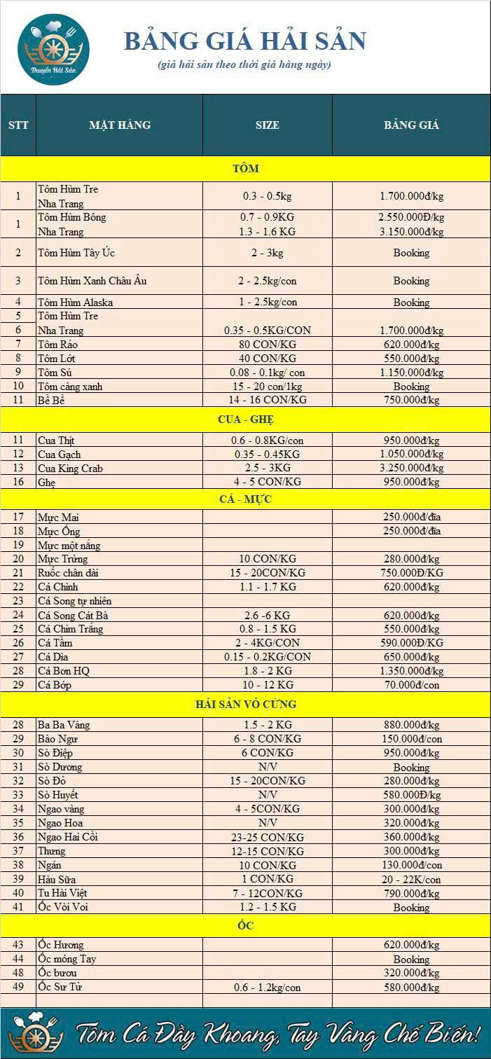 - Món nổi bật: Tôm hùm tre nướng hương tỏi, gỏi tôm Thuyền Hải Sản, lẩu tôm bầu, lẩu cua bể, lẩu bề bề đầu xay