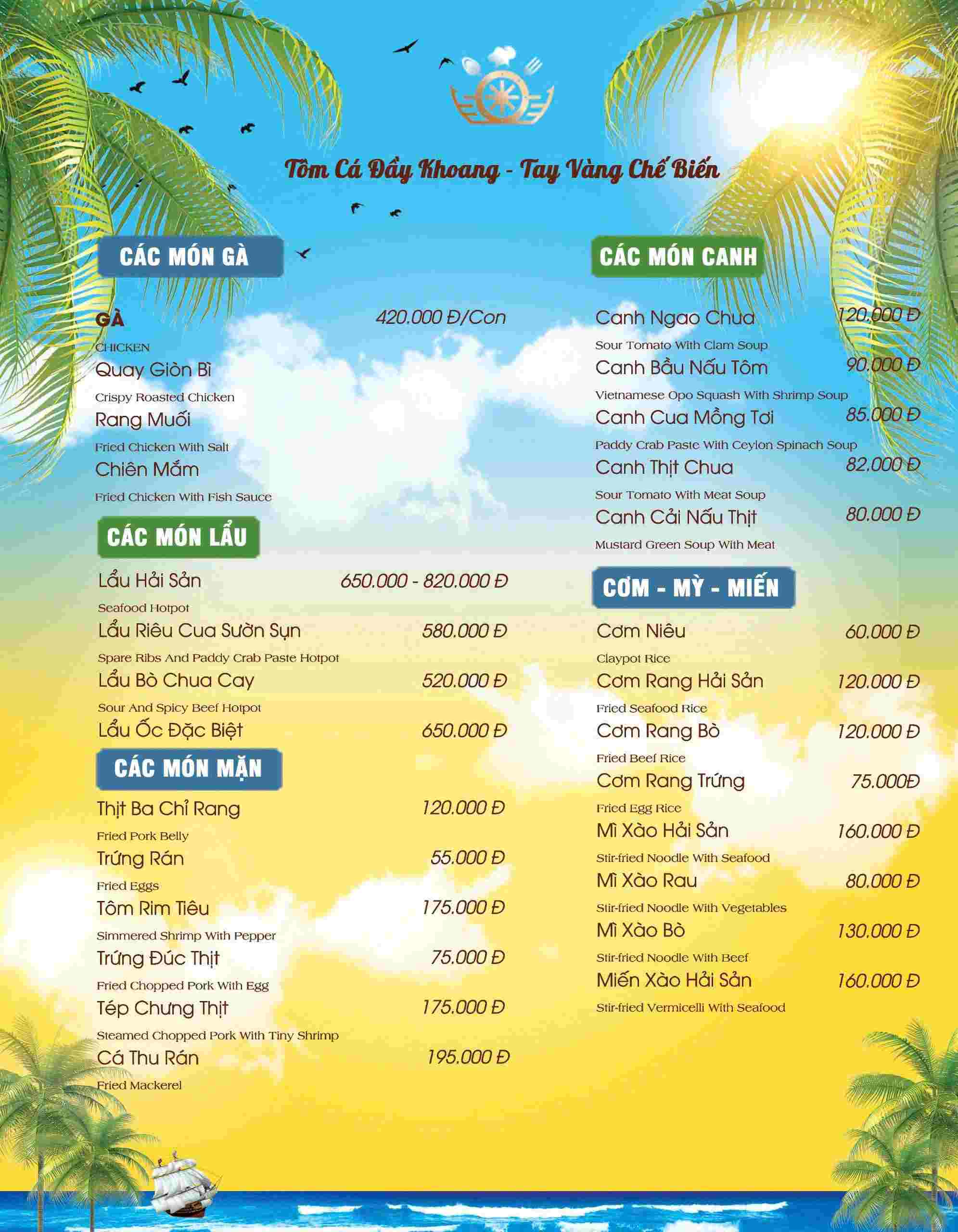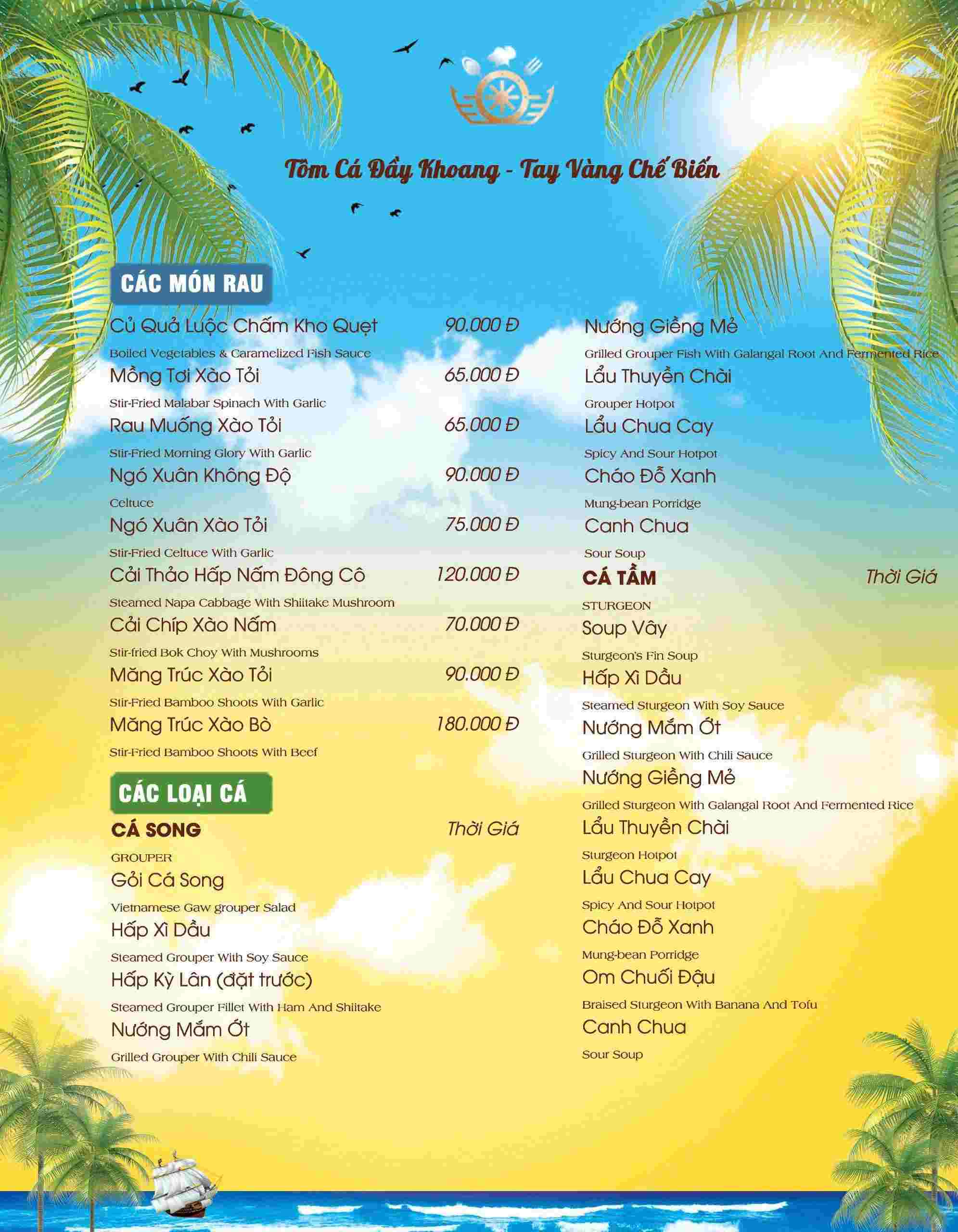 Thực đơn tại Nhà hàng Thuyền Hải Sản khá phong phú, phù hợp với nhiều khẩu vị. Các món được sắp xếp rõ ràng, giúp thực khách dễ lựa chọn theo nhu cầu của nhóm.