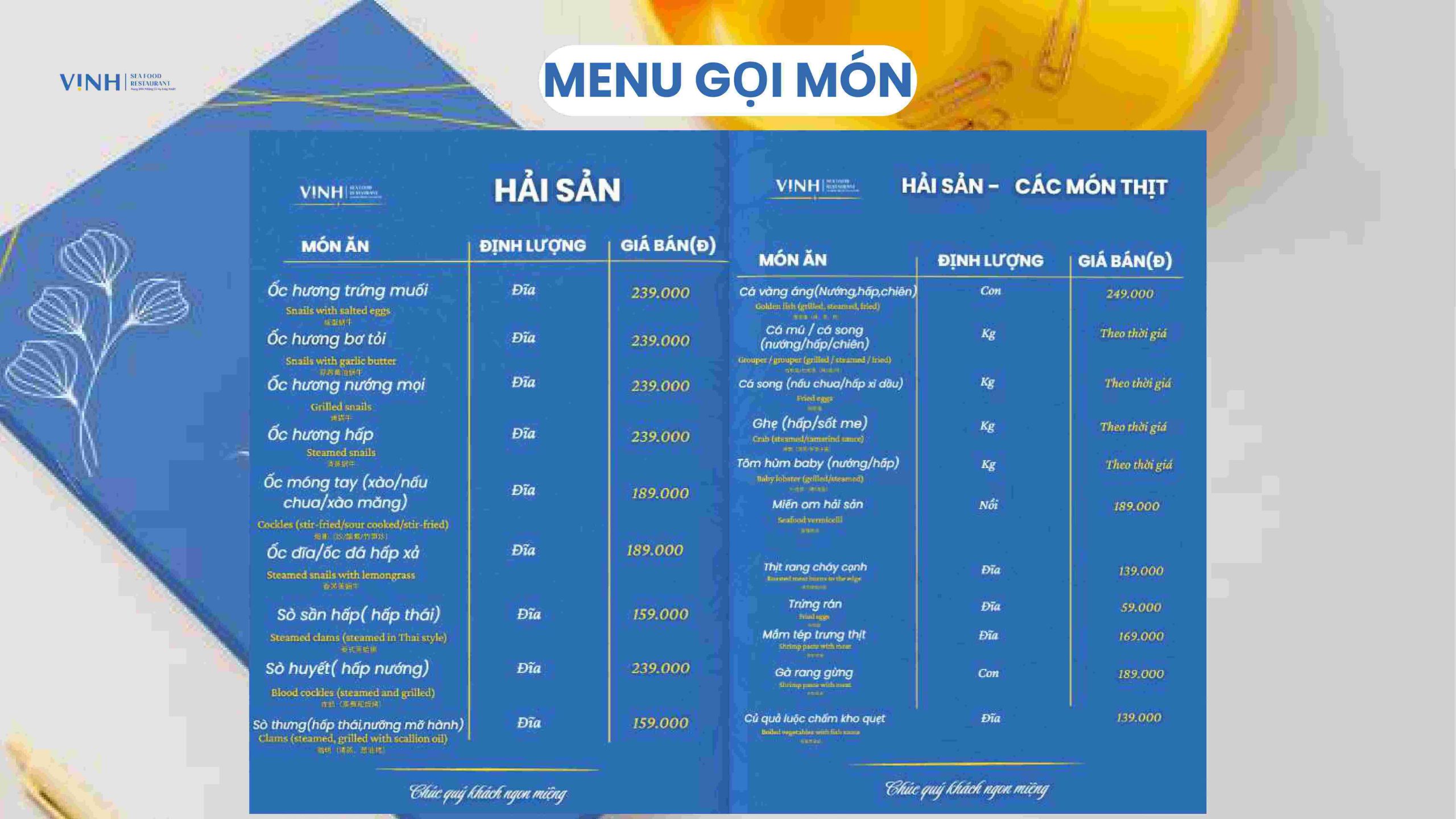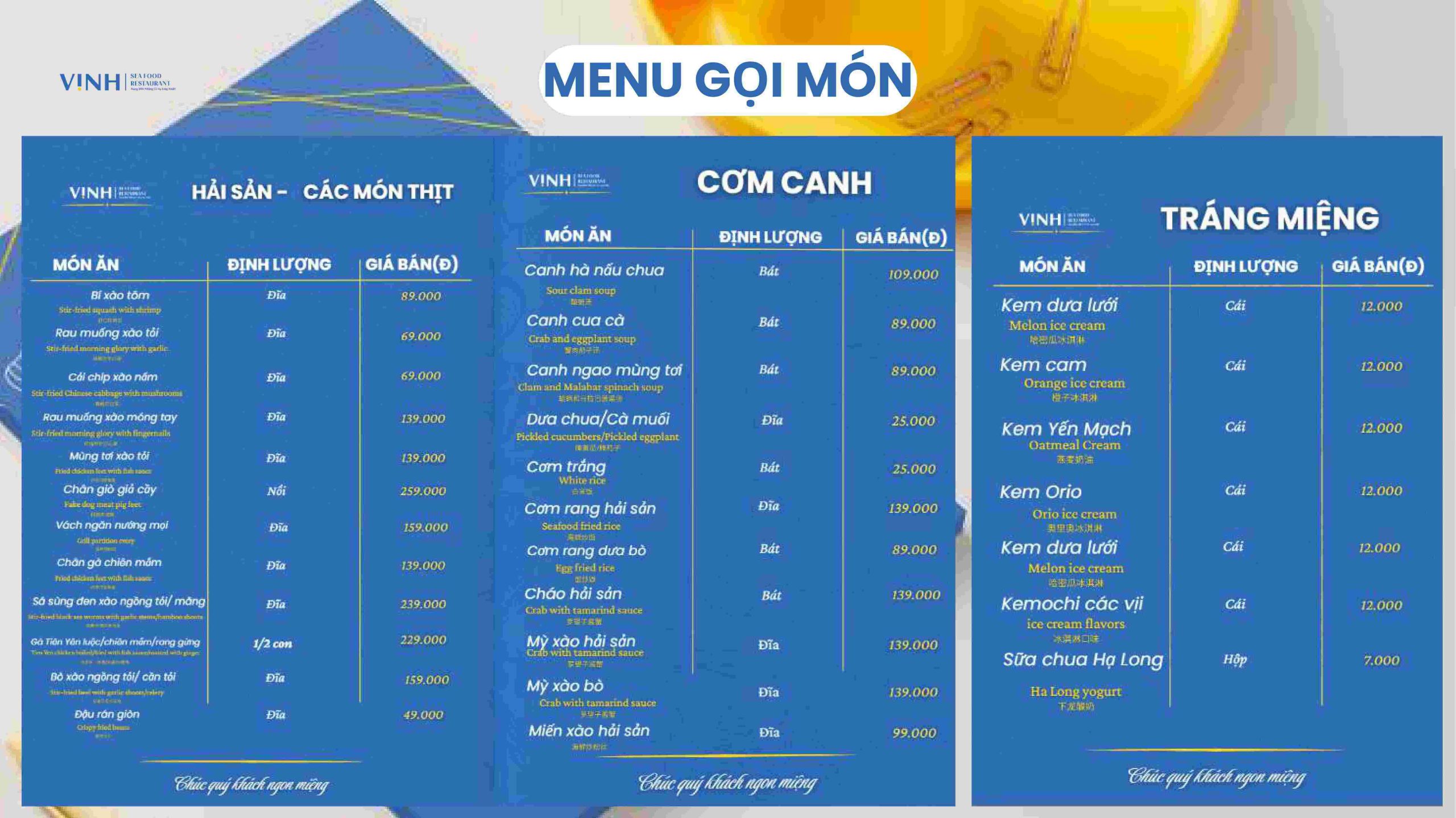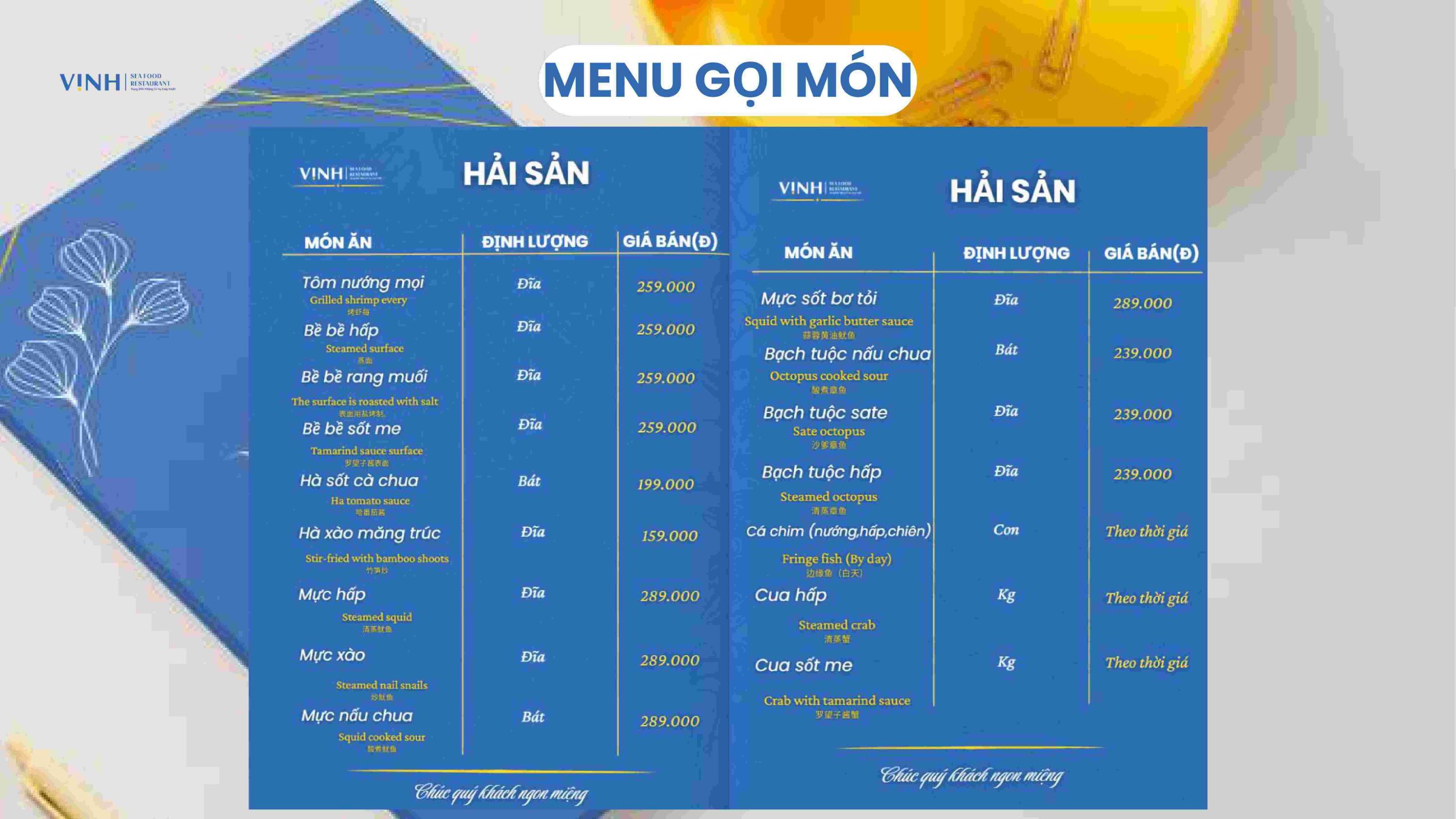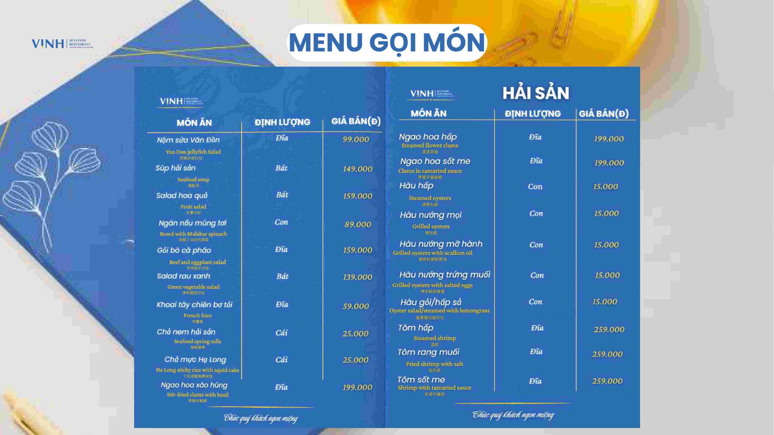 Thực đơn tại Nhà hàng Vịnh Seafood được xây dựng đa dạng, đáp ứng trọn vẹn nhu cầu của nhiều đối tượng thực khách. Bên cạnh các món hải sản tươi sống chế biến theo phong cách Hạ Long, nhà hàng còn phục vụ đầy đủ món Việt quen thuộc, món thịt, rau xanh, cơm – canh và tráng miệng.