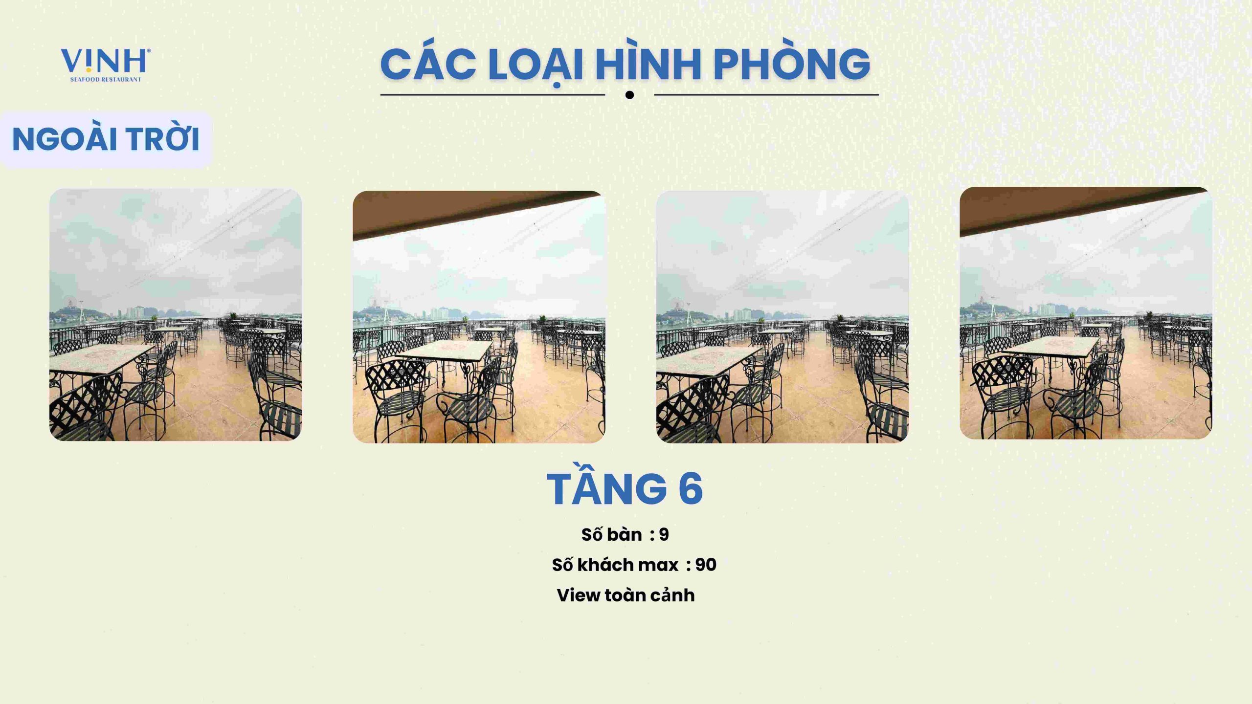 Tầng 6 là khu sân thượng ngoài trời, sức chứa khoảng 90 khách. Không gian thoáng đãng, ánh đèn lung linh khi đêm xuống, mở ra tầm nhìn hướng biển đầy cảm xúc. Đây cũng là khu vực check-in được nhiều thực khách yêu thích khi ghé Nhà hàng Vịnh Seafood.