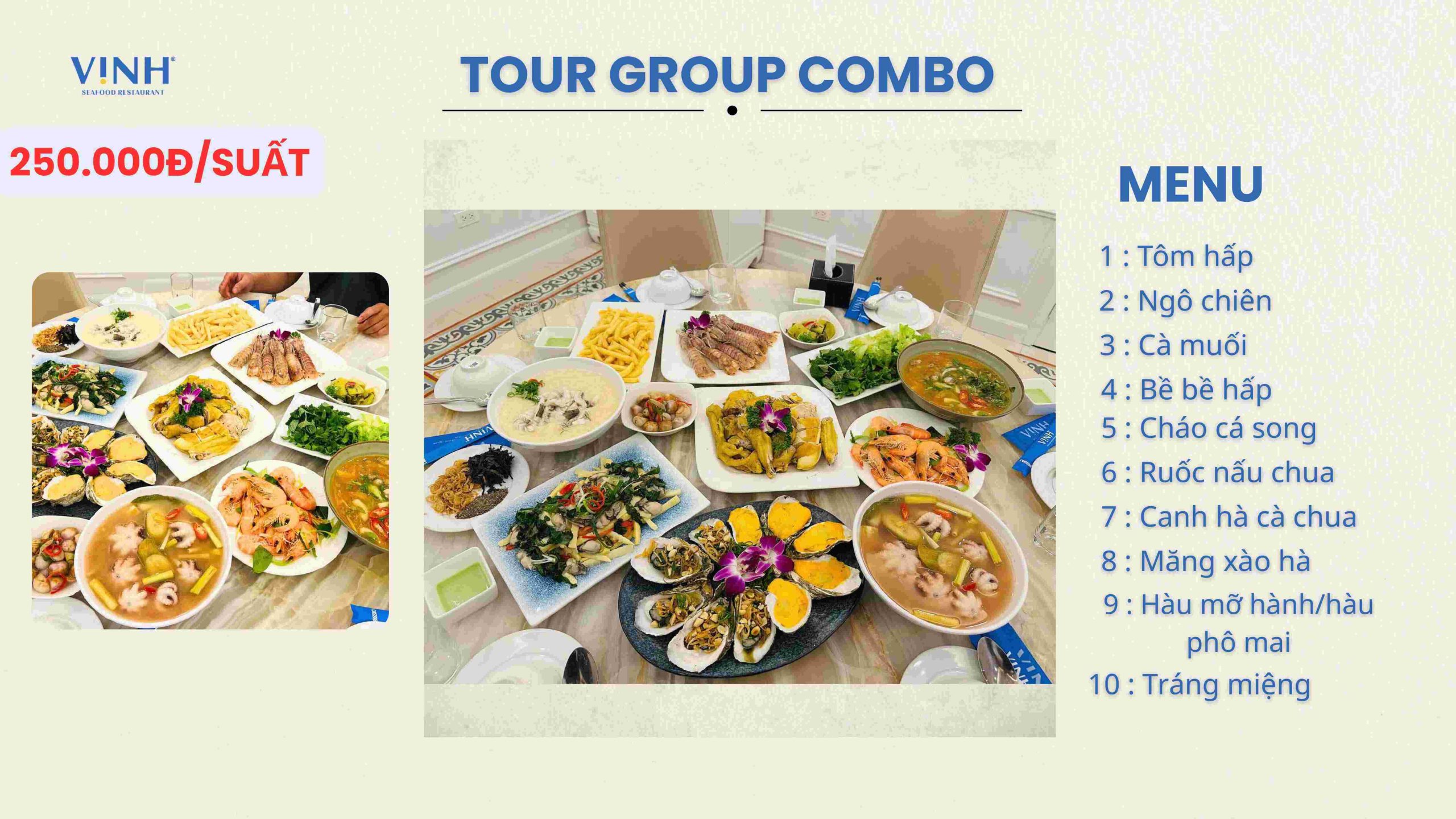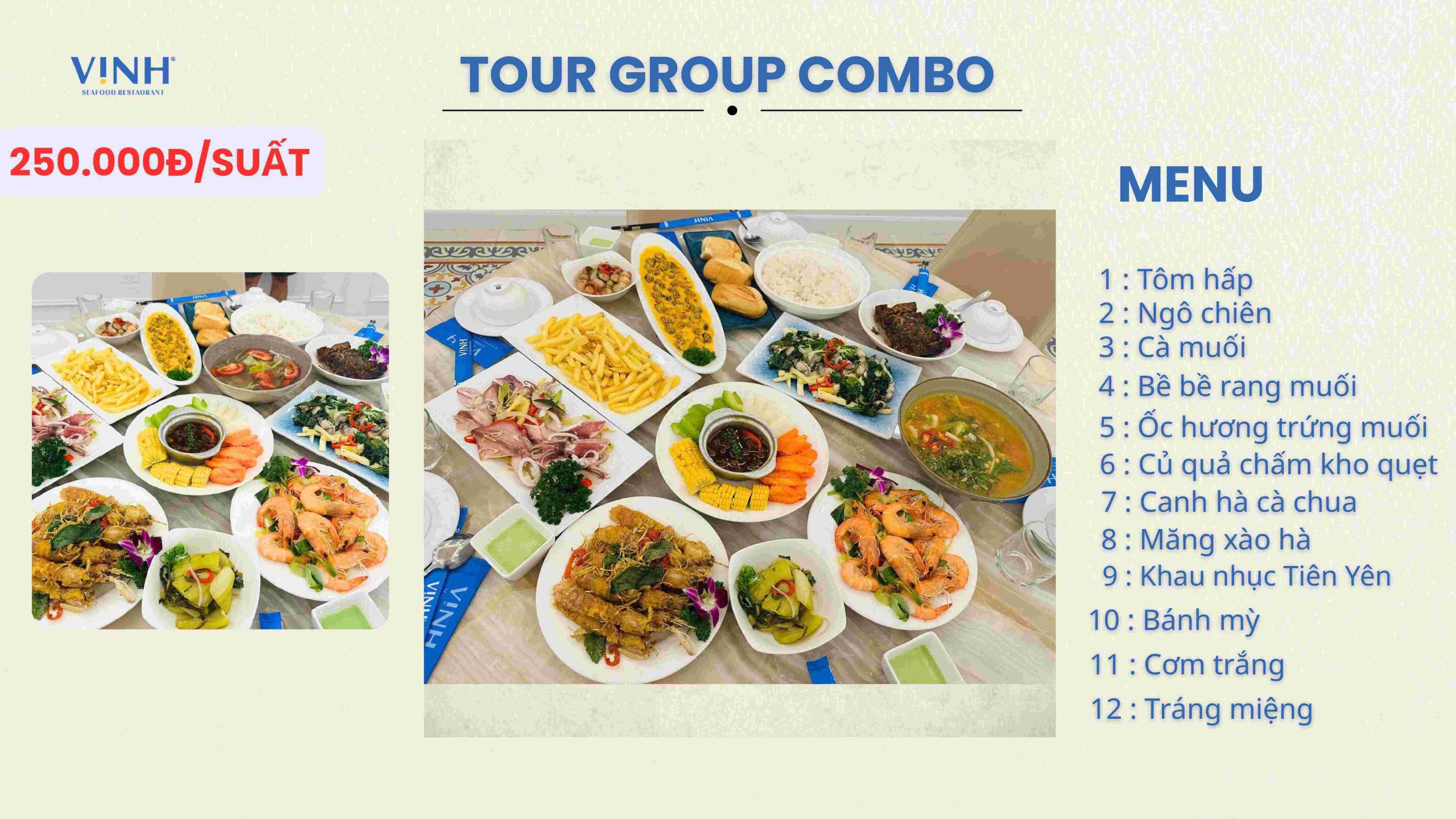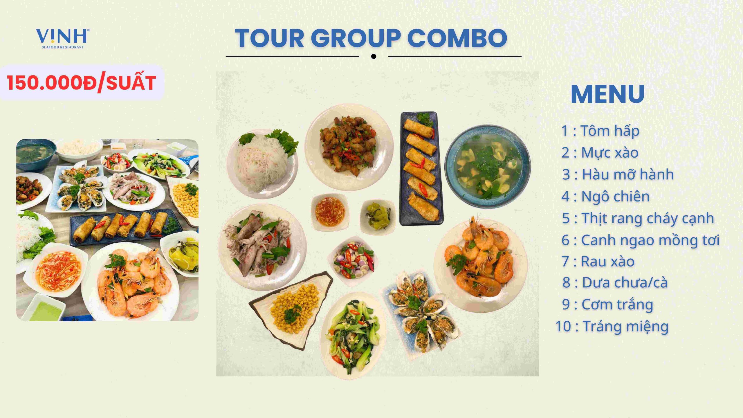Đặc biệt, Nhà hàng Vịnh Seafood có Tour Group Combo với mức giá hợp lý theo suất. Thực đơn combo được thiết kế cân đối, giúp đoàn đông trải nghiệm nhiều món đặc trưng của nhà hàng trong một bữa ăn trọn vẹn. Đây là lựa chọn rất được các đoàn du lịch và tập thể ưa chuộng nhờ chi phí hợp lý so với chất lượng và không gian.