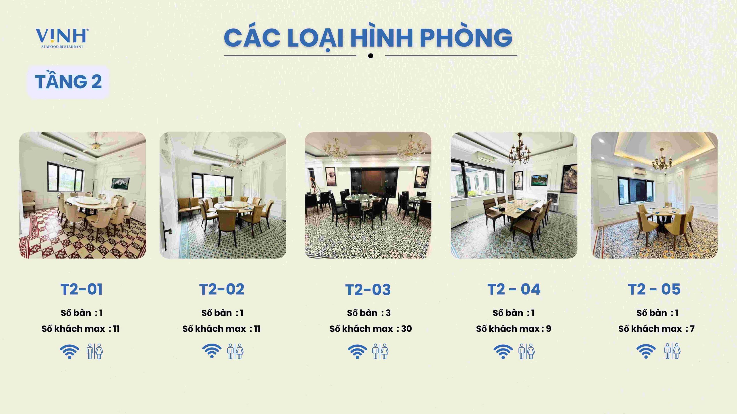 Tầng 2 sở hữu 5 phòng linh hoạt, từ 7 đến 30 khách. Thiết kế ấm áp, dễ tùy chỉnh bàn ghế theo nhu cầu từng đoàn.