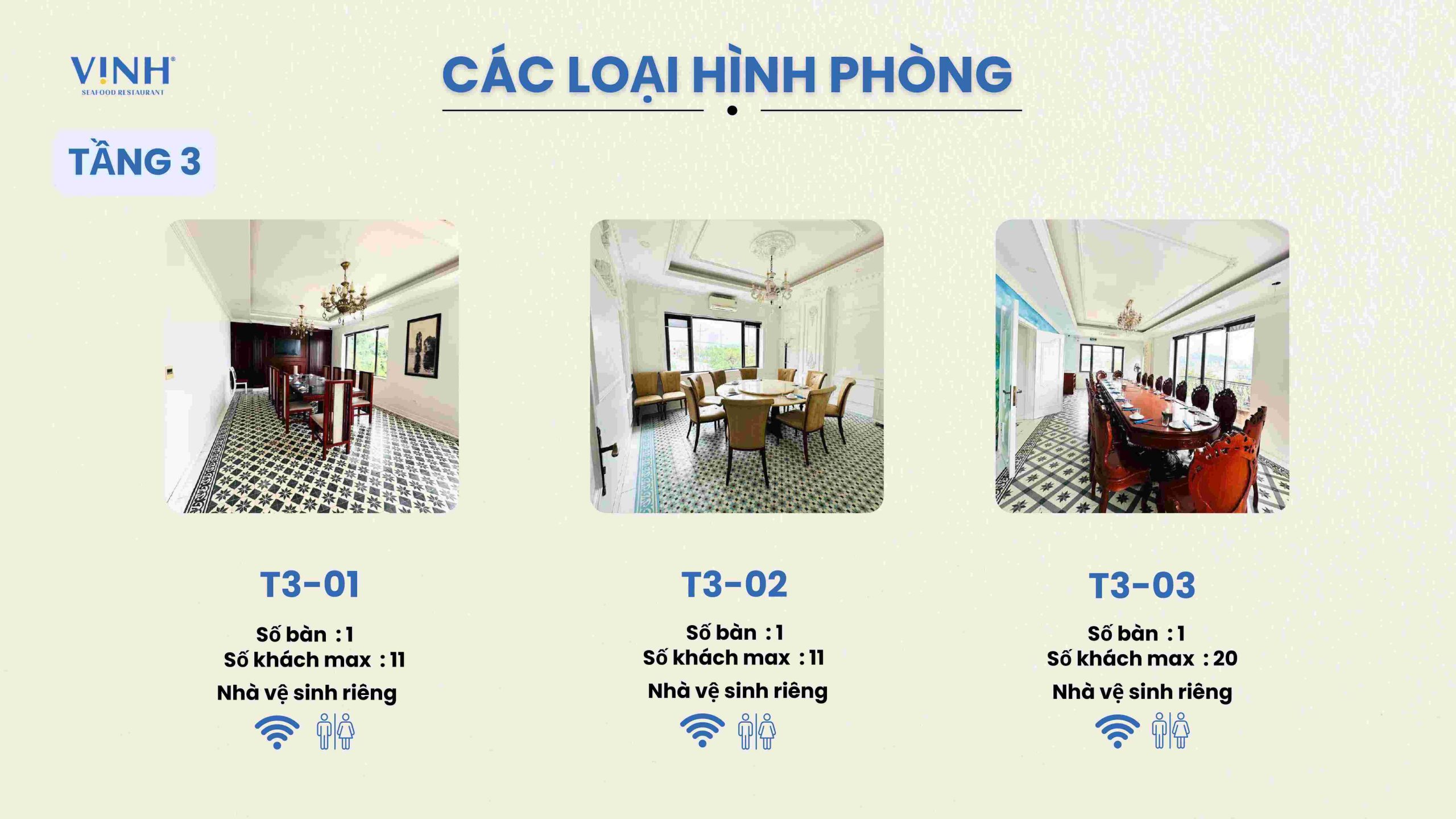 Tầng 3 có 3 phòng riêng, sức chứa 11 đến 20 khách. Đây là không gian lý tưởng cho nhóm bạn, đoàn nhỏ hoặc các buổi gặp gỡ đối tác cần sự riêng tư.