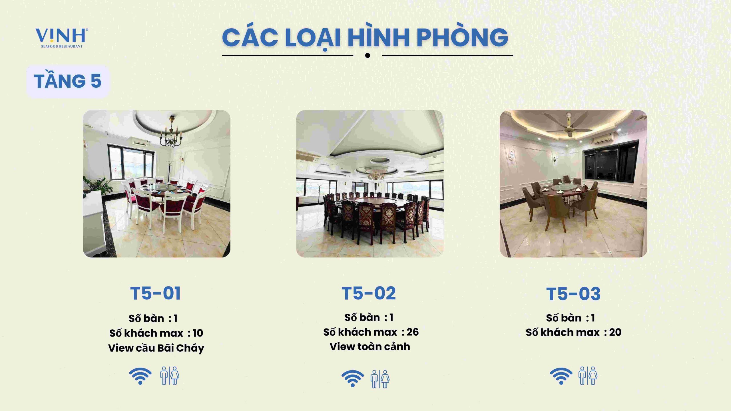 Tầng 5 gồm 3 phòng riêng, từ 10 đến 26 khách. Phong cách thiết kế yên tĩnh, chỉn chu, rất được ưa chuộng cho tiếp khách cao cấp.