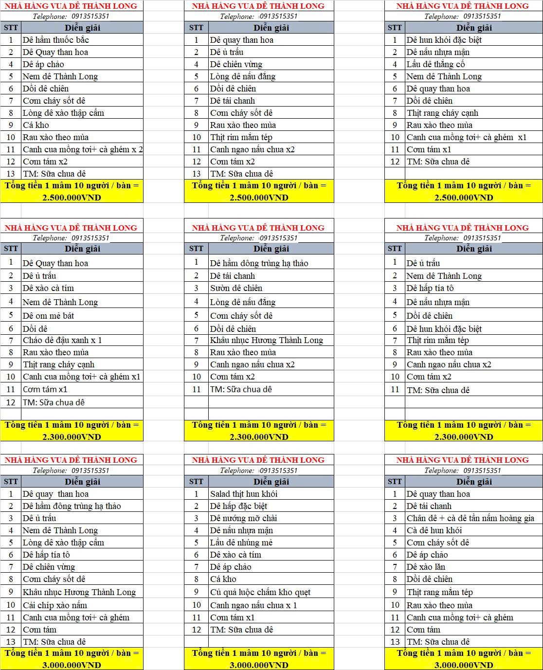 Bên cạnh việc phục vụ gọi món, Nhà hàng Vua Dê 1969 còn có các set menu thiết kế sẵn, giúp thực khách dễ dàng lựa chọn và chủ động ngân sách. Các set menu kết hợp hài hòa giữa món dê đặc sản, món ăn kèm truyền thống và canh – cơm, phù hợp cho bàn từ 6 đến 10 người. Đây là giải pháp lý tưởng cho gia đình, đoàn khách, tour du lịch hay tiệc liên hoan, vừa tiết kiệm thời gian gọi món, vừa đảm bảo bữa ăn đầy đủ, đồng đều và tròn vị, mang đến trải nghiệm ẩm thực Ninh Bình tiện lợi và chỉn chu.
