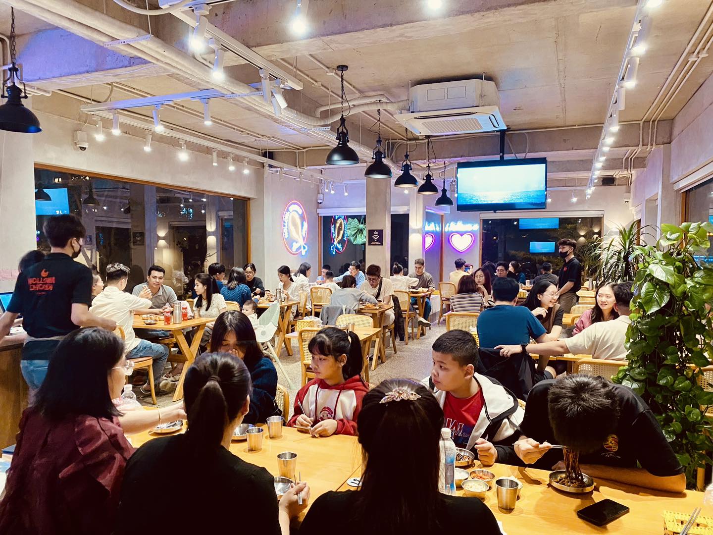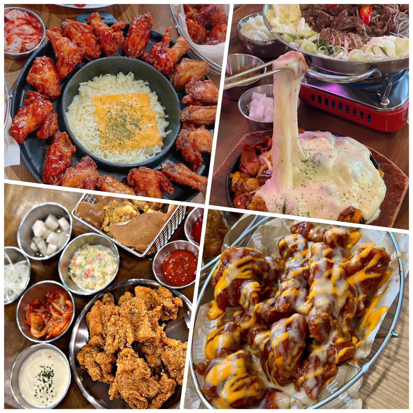 - Món ăn đặc trưng: set gà rán với nhiều loại sốt (cay, phô mai, mật ong), mì tương đen, mì hải sản cay, BBQ chicken, lẩu Hàn (hotpot)…