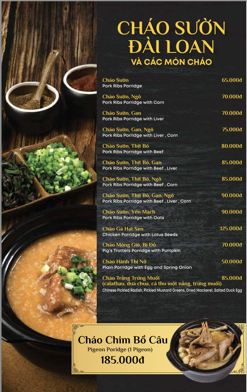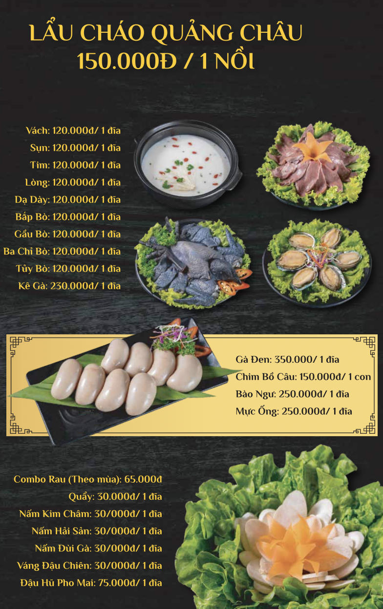 Quán cũng phục vụ lẩu cháo cho nhóm bốn người trở lên. Nước dùng thanh và không quá đậm. Lẩu duy trì nhiệt lâu nên phù hợp cho những bữa ăn kéo dài. Những khách thích phong cách Á Đông có thể chọn lẩu cháo Quảng Châu hoặc lẩu khô. Hương vị nhẹ và dễ thưởng thức nên rất hợp xu hướng hiện nay.