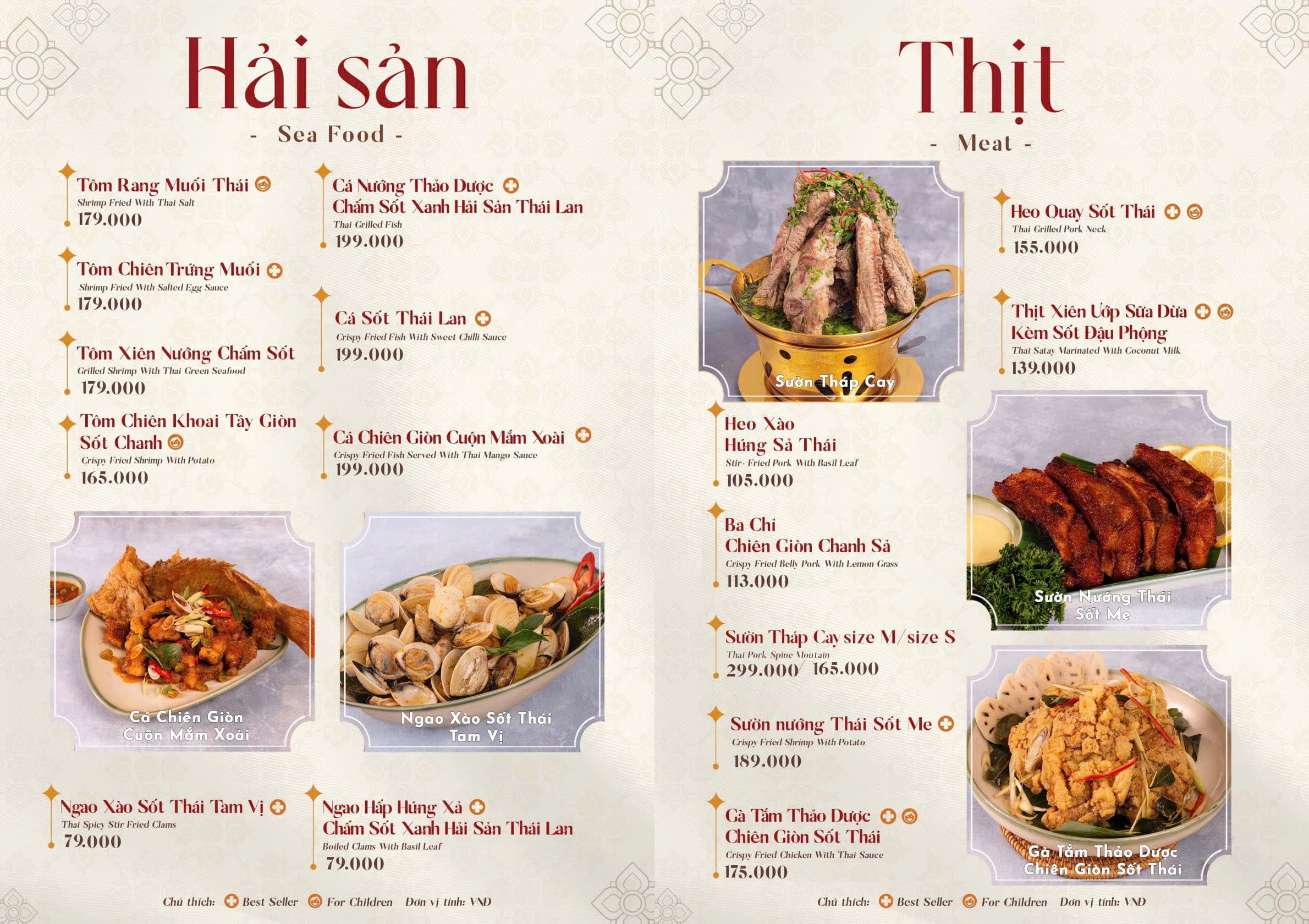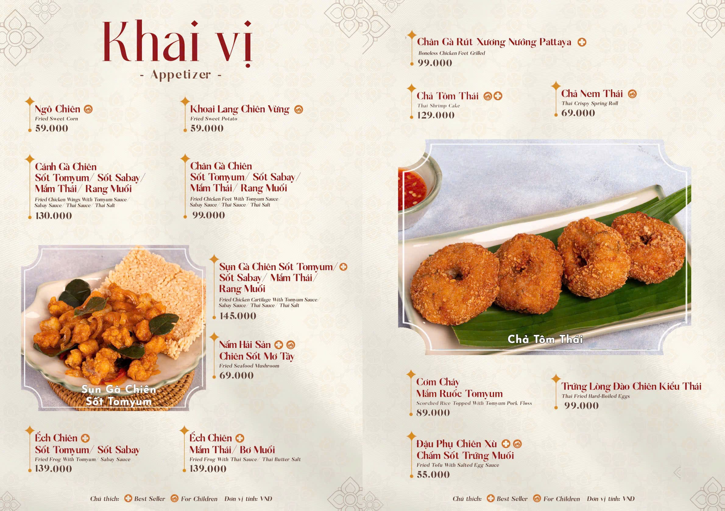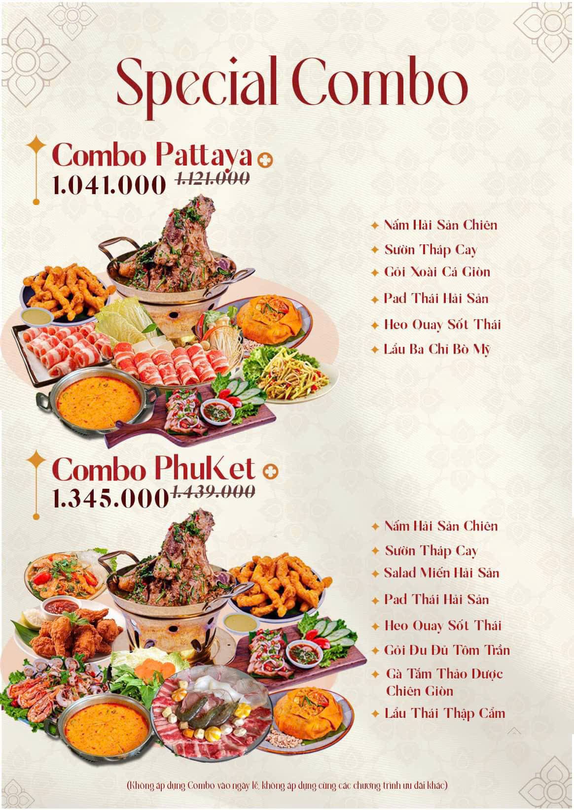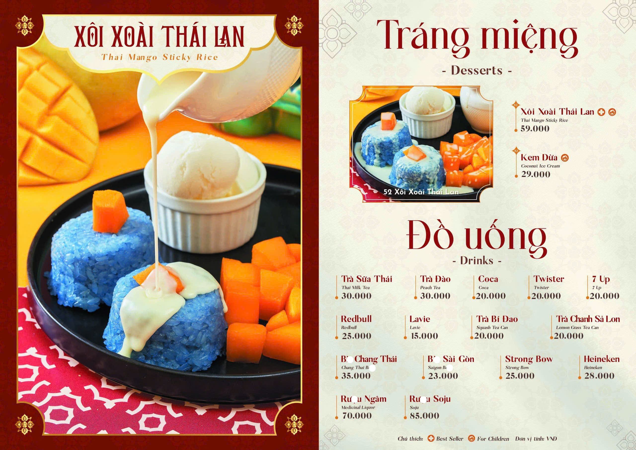 - Món nổi bật: Lẩu Thái chua cay, Pad Thai, Tom Yum, Salad miến, Cơm chiên trái thơm, Gỏi đu đủ Thái, Gà chiên sốt Thái, Hải sản sốt Thải, Xôi xoài, Canh Thái hải sản, Trà Thái…