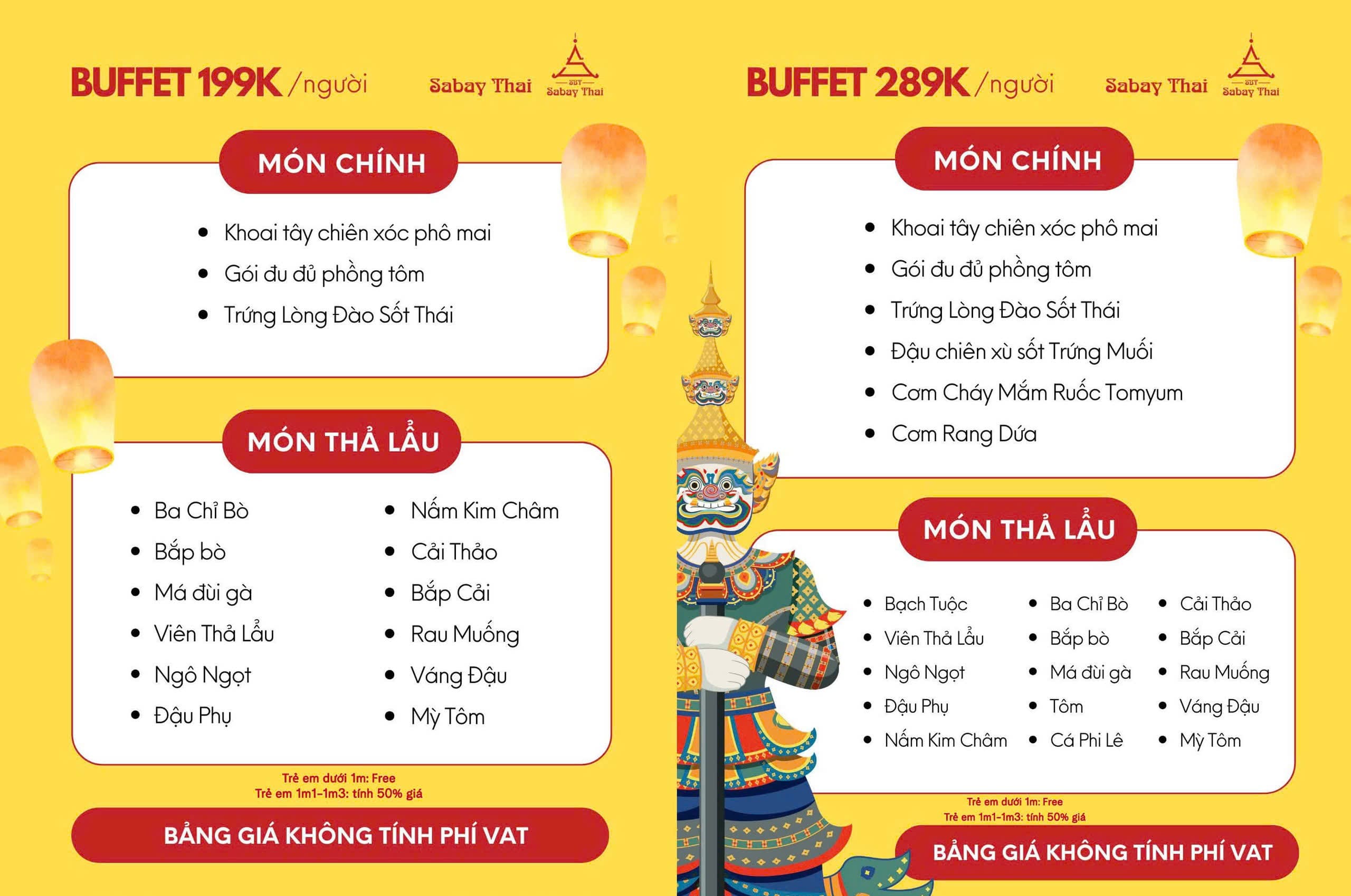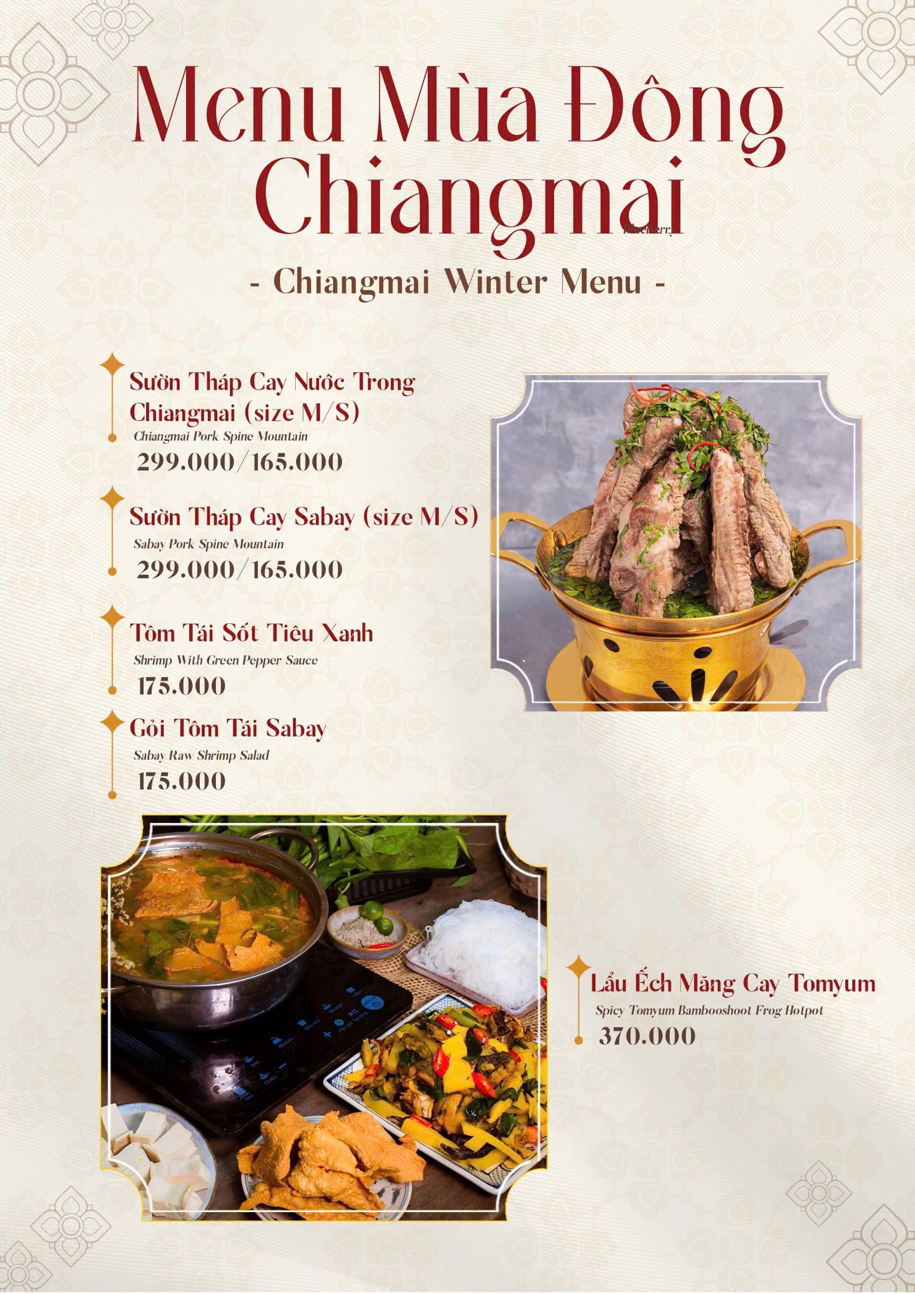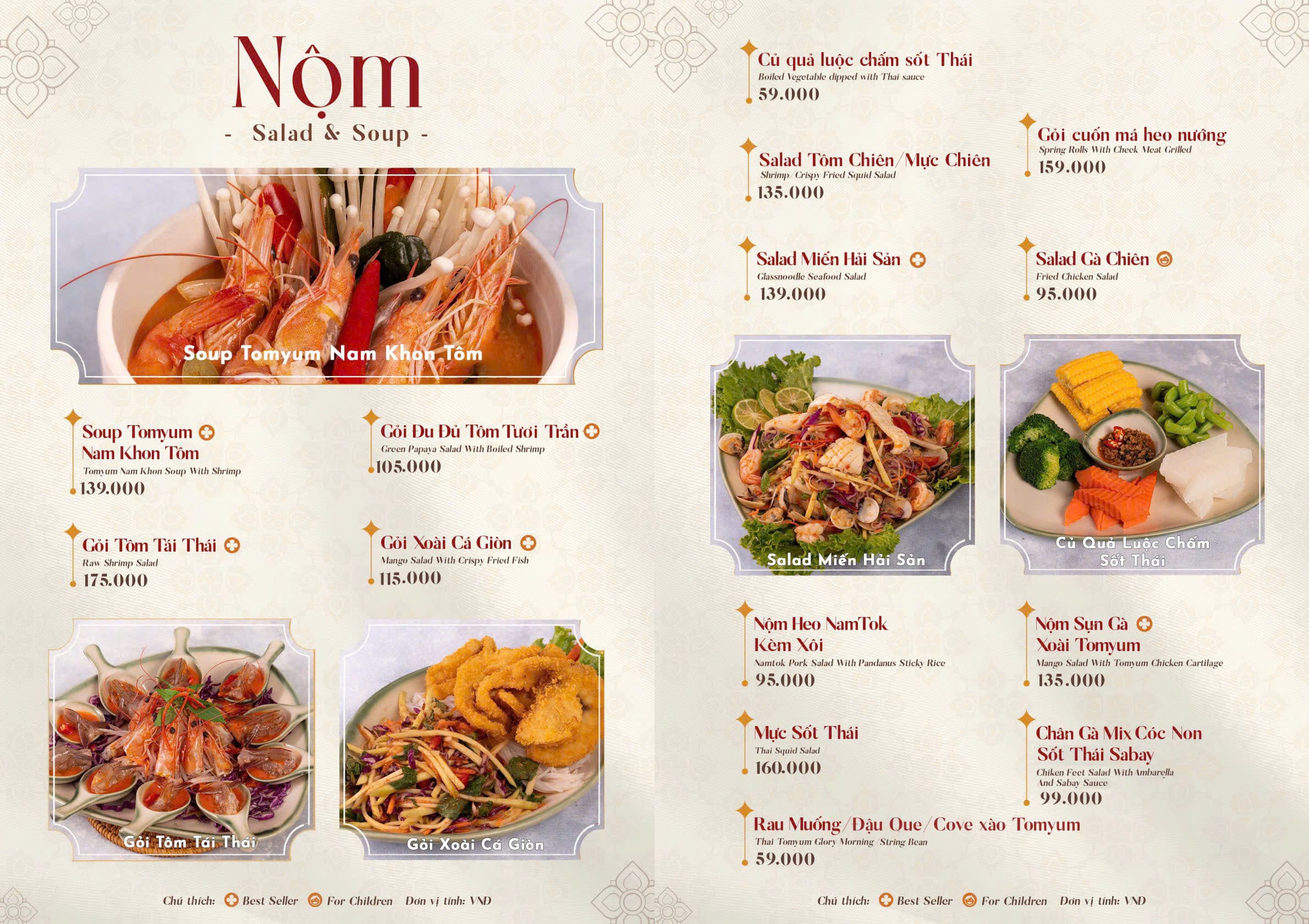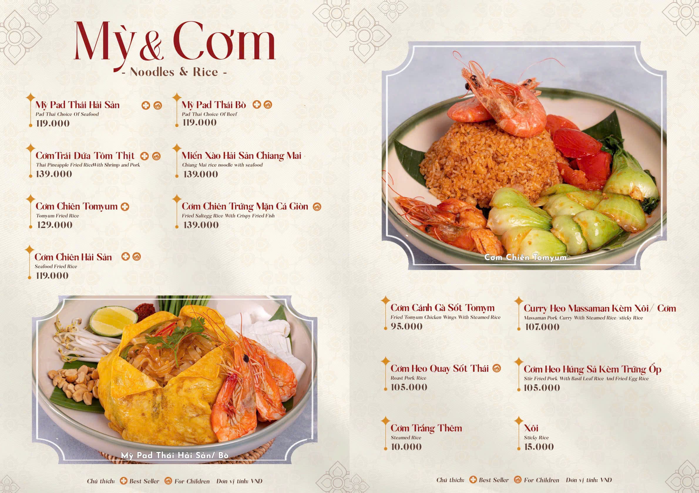 - Món nổi bật: Lẩu Thái chua cay, Pad Thai, Tom Yum, Salad miến, Cơm chiên trái thơm, Gỏi đu đủ Thái, Gà chiên sốt Thái, Hải sản sốt Thải, Xôi xoài, Canh Thái hải sản, Trà Thái…
