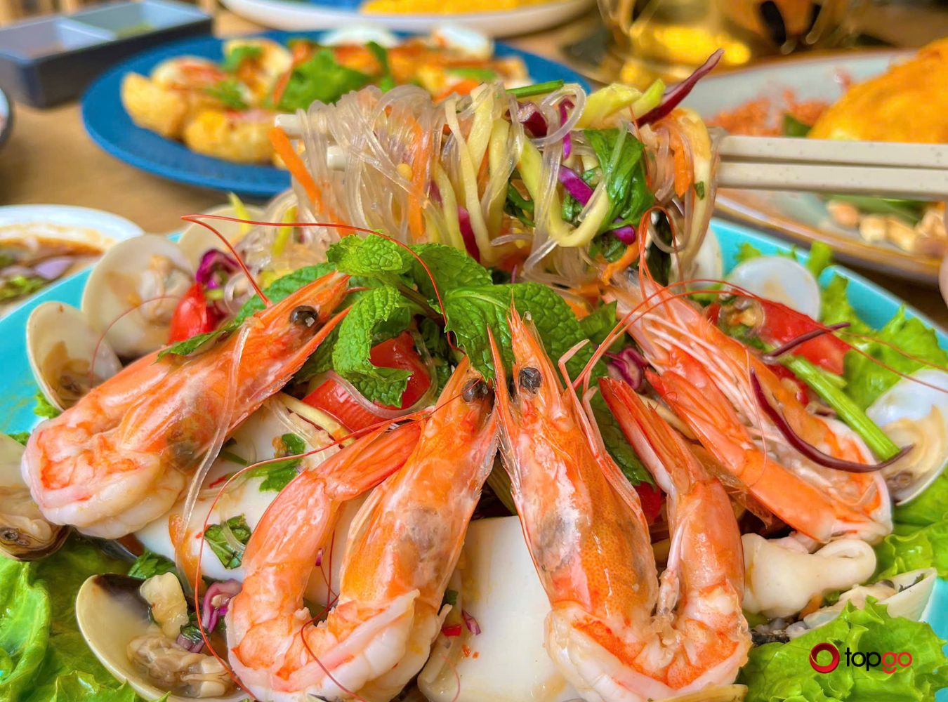 Salad miến gây ấn tượng với sắc màu tươi sáng, sợi miến dai nhẹ, thấm vị chua ngọt hài hòa. Gỏi đu đủ Thái mang đến cảm giác mát lành, giòn tươi, khơi dậy vị giác từ miếng đầu tiên.