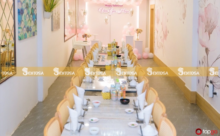 Nhà hàng có quy mô lớn, phù hợp cho cả tiệc nhỏ và sự kiện lớn. Sentosa Huỳnh Thúc Kháng được chia làm hai tầng. Mỗi tầng đều có thiết kế riêng, đáp ứng mọi nhu cầu của khách hàng.