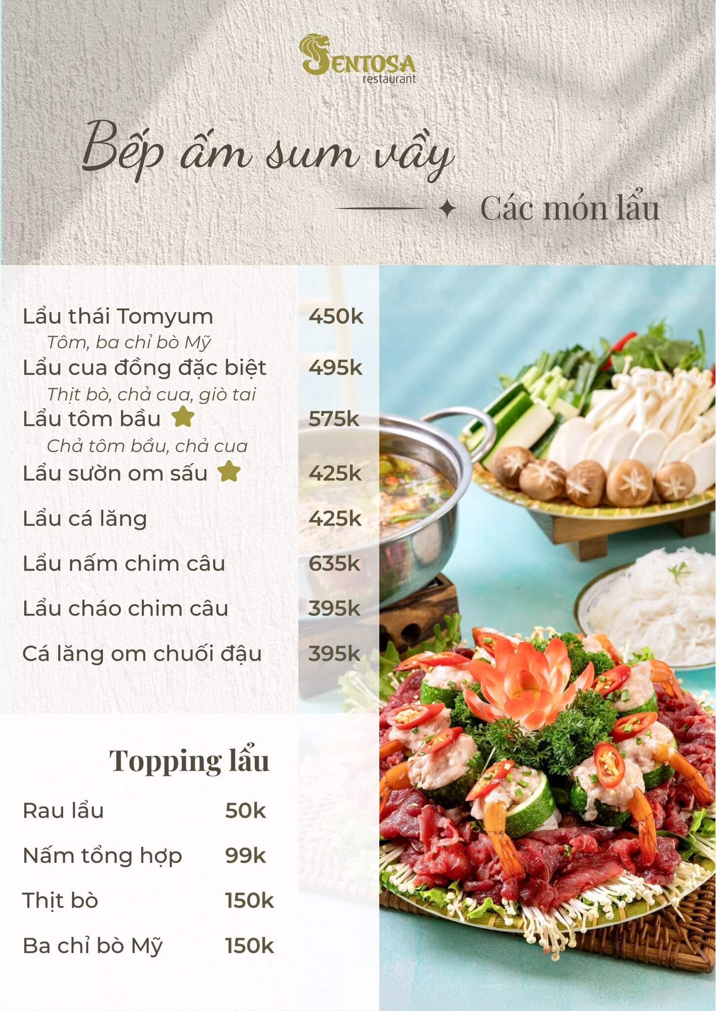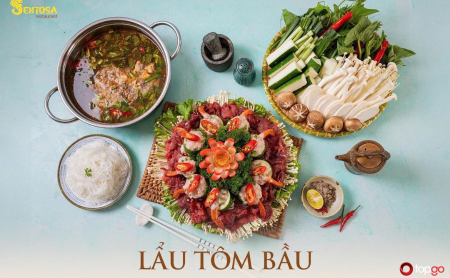 Thực khách có thể thưởng thức lẩu tôm bầu trong không khí ấm áp bên người thân, bạn bè. Món ăn này mang hương vị tự nhiên. Phù hợp với cả gia đình và được xem là lựa chọn không thể bỏ qua khi đến Sentosa Huỳnh Thúc Kháng.