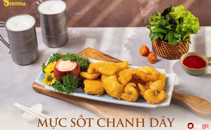 Mực sốt chanh dây là món ăn mang phong cách trẻ trung, hiện đại tại Sentosa Huỳnh Thúc Kháng. Mực tươi được chiên giòn, sau đó phủ đều lớp sốt chanh dây có vị chua nhẹ, ngọt thanh. Hương vị tươi mới, màu sắc bắt mắt. Khiến món ăn này trở thành lựa chọn hàng đầu của nhiều thực khách trẻ.