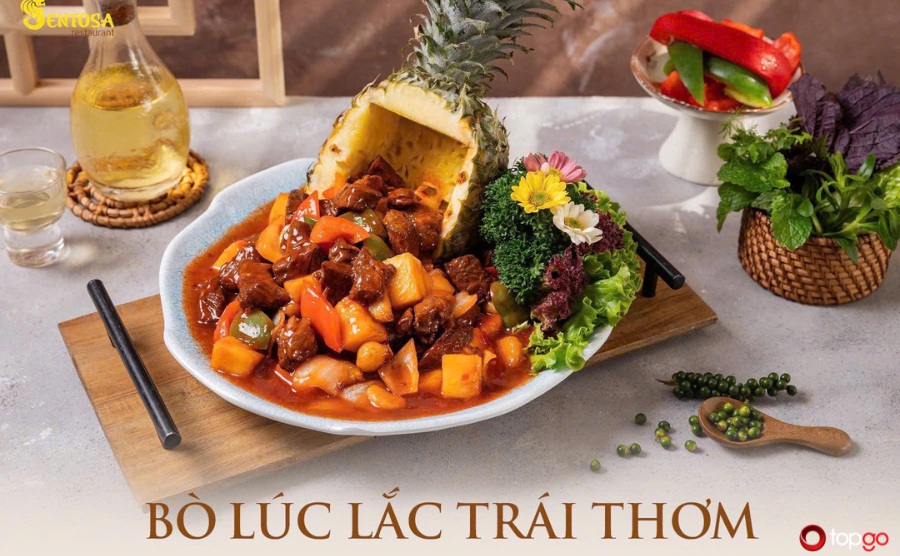 Thực khách yêu thích ẩm thực hiện đại chắc chắn sẽ ấn tượng với món bò lúc lắc trái thơm tại Sentosa Huỳnh Thúc Kháng. Thịt bò mềm, được cắt miếng vừa ăn. Xào cùng trái thơm tươi tạo nên hương vị chua ngọt hài hòa.