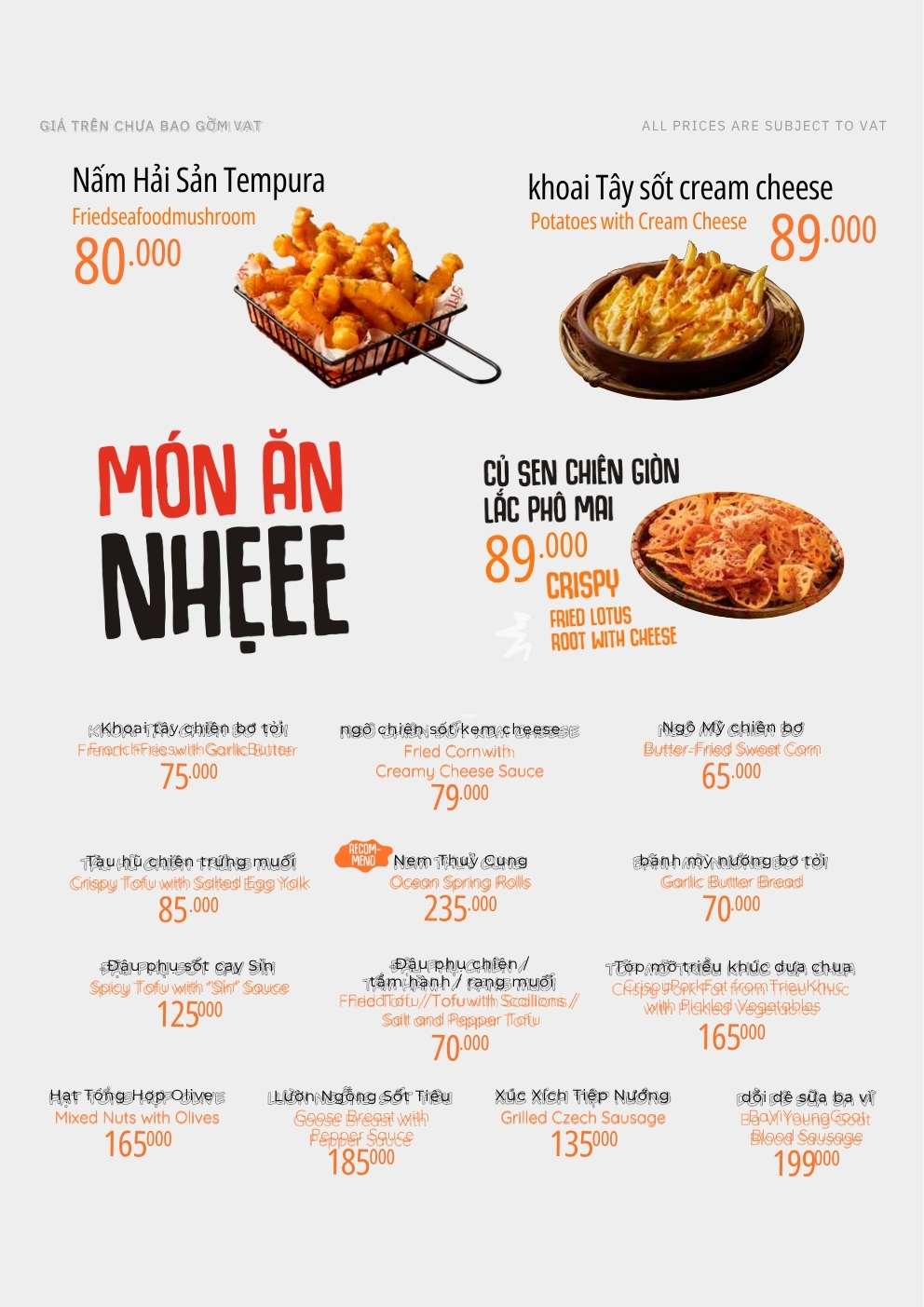 Các món nướng và đồ nhắm Việt truyền thống được chế biến hiện đại. Hương vị đậm đà, trình bày bắt mắt. Đây là lựa chọn lý tưởng để thưởng thức cùng thức uống tinh tế mang hương vị riêng.