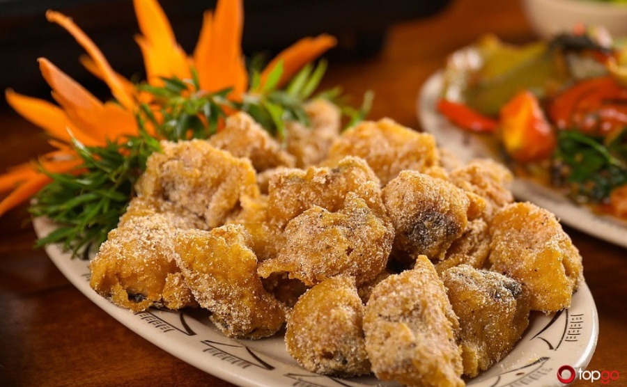 Cá được tẩm ướp khéo léo, chiên giòn bên ngoài nhưng vẫn giữ được độ ngọt mềm bên trong. Lớp muối rang phủ đều mang lại hương vị đậm đà mà không hề khô cứng. Món ăn này thường được gọi nhiều trong các bữa tiệc gia đình hoặc hội họp bạn bè.