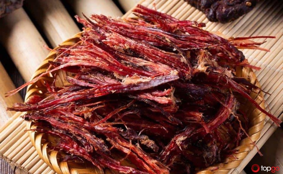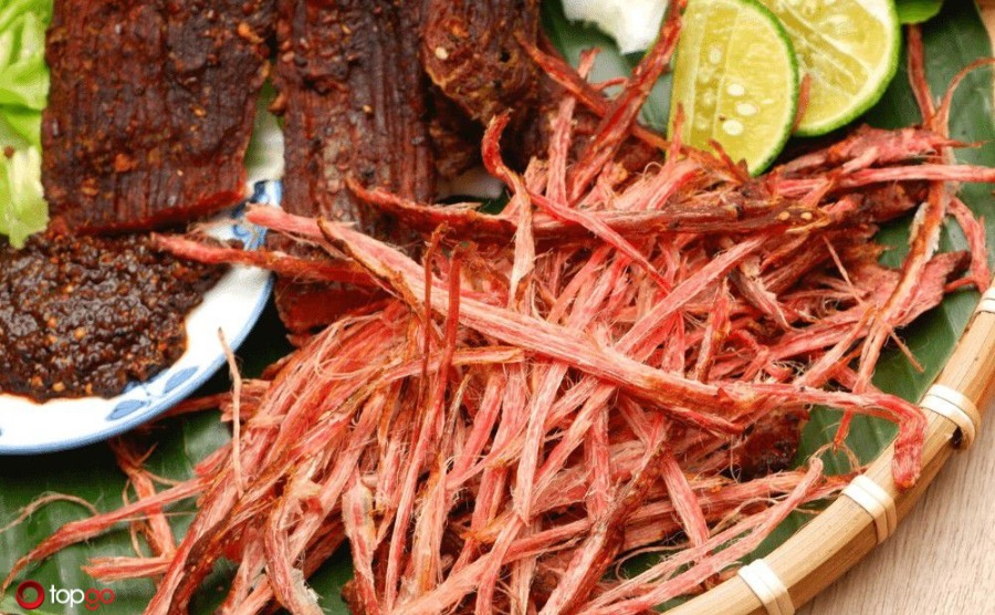 Một món ăn khác làm nên tên tuổi của Sinh Thái Nam Hồng – Ẩm Thực Chợ Quê chính là trâu gác bếp. Thịt trâu được tẩm ướp gia vị truyền thống rồi treo gác bếp để hun khói.