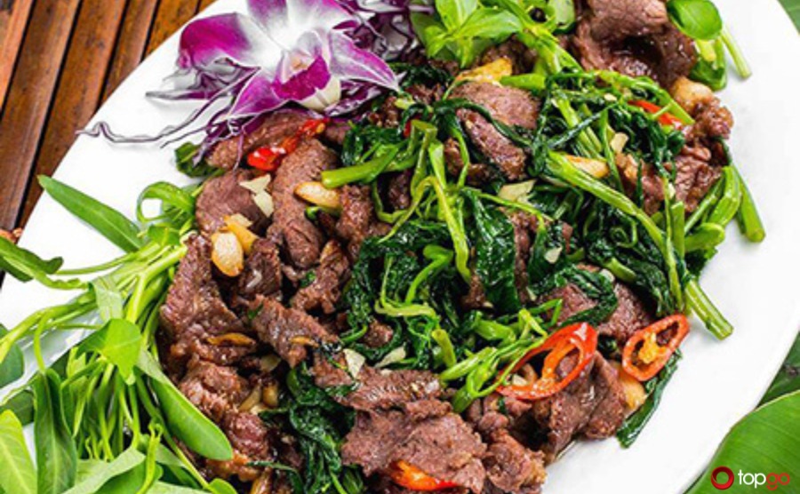 Thịt trâu mềm, được xào nhanh tay với rau muống xanh tươi, giòn ngọt. Sự kết hợp này tạo nên hương vị gần gũi, gợi nhớ đến những bữa cơm gia đình. Đây là lựa chọn quen thuộc của nhiều thực khách khi muốn tìm sự giản dị trong bữa ăn.