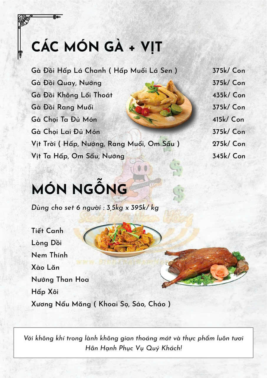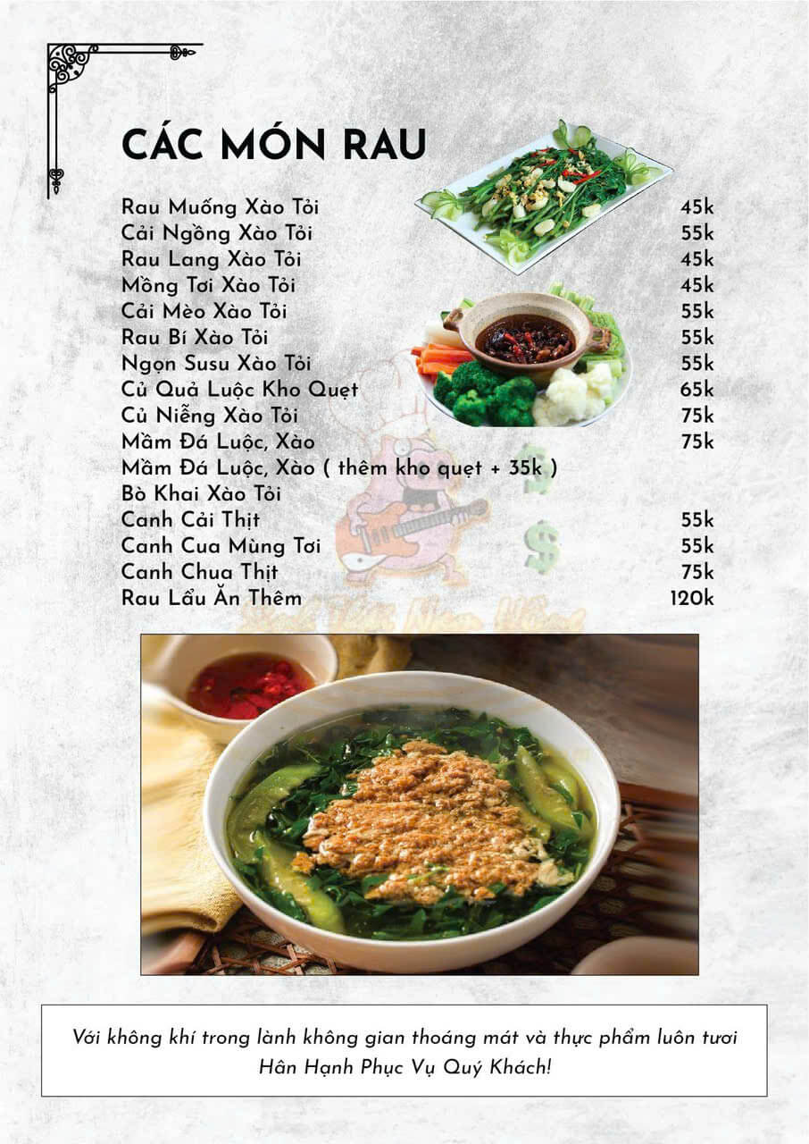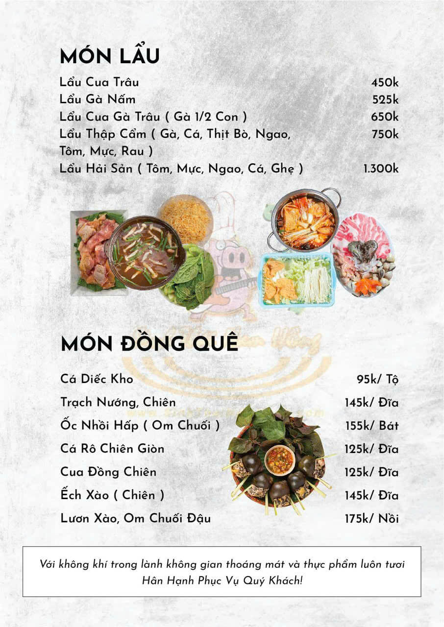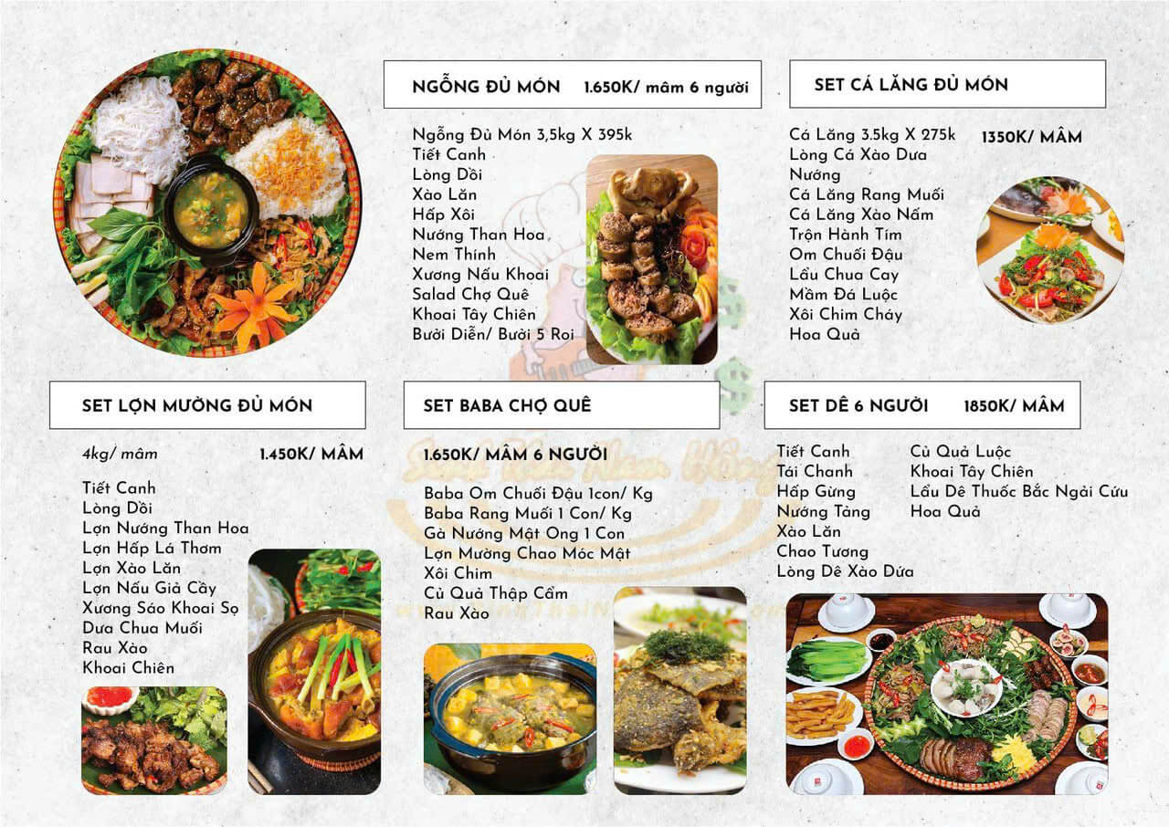 Đến với Sinh Thái Nam Hồng – Ẩm Thực Chợ Quê, thực khách sẽ được trải nghiệm một thực đơn đa dạng, mang đậm dấu ấn vùng miền và ẩm thực truyền thống. Từng món ăn đều được chế biến tỉ mỉ, giữ trọn hương vị tự nhiên, đồng thời mang đến cảm giác thân quen.